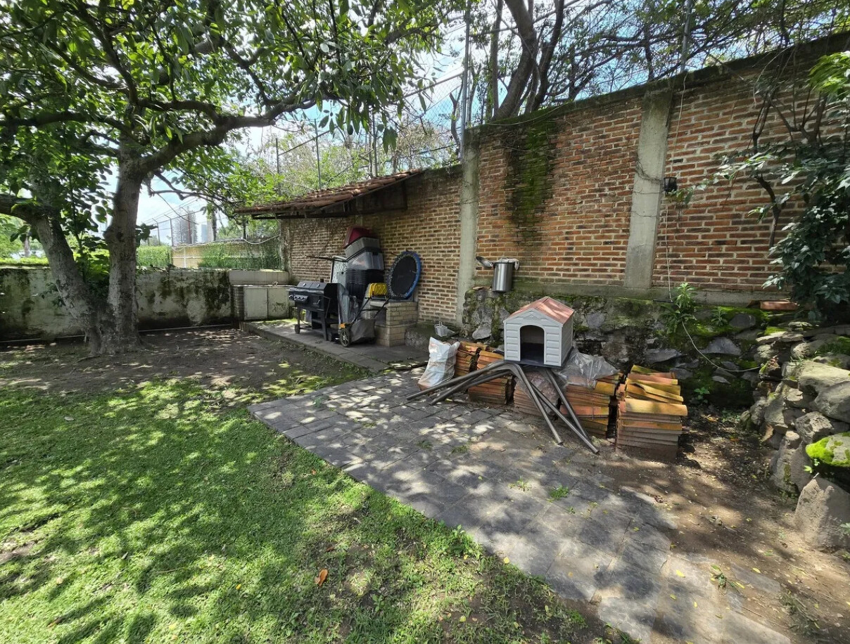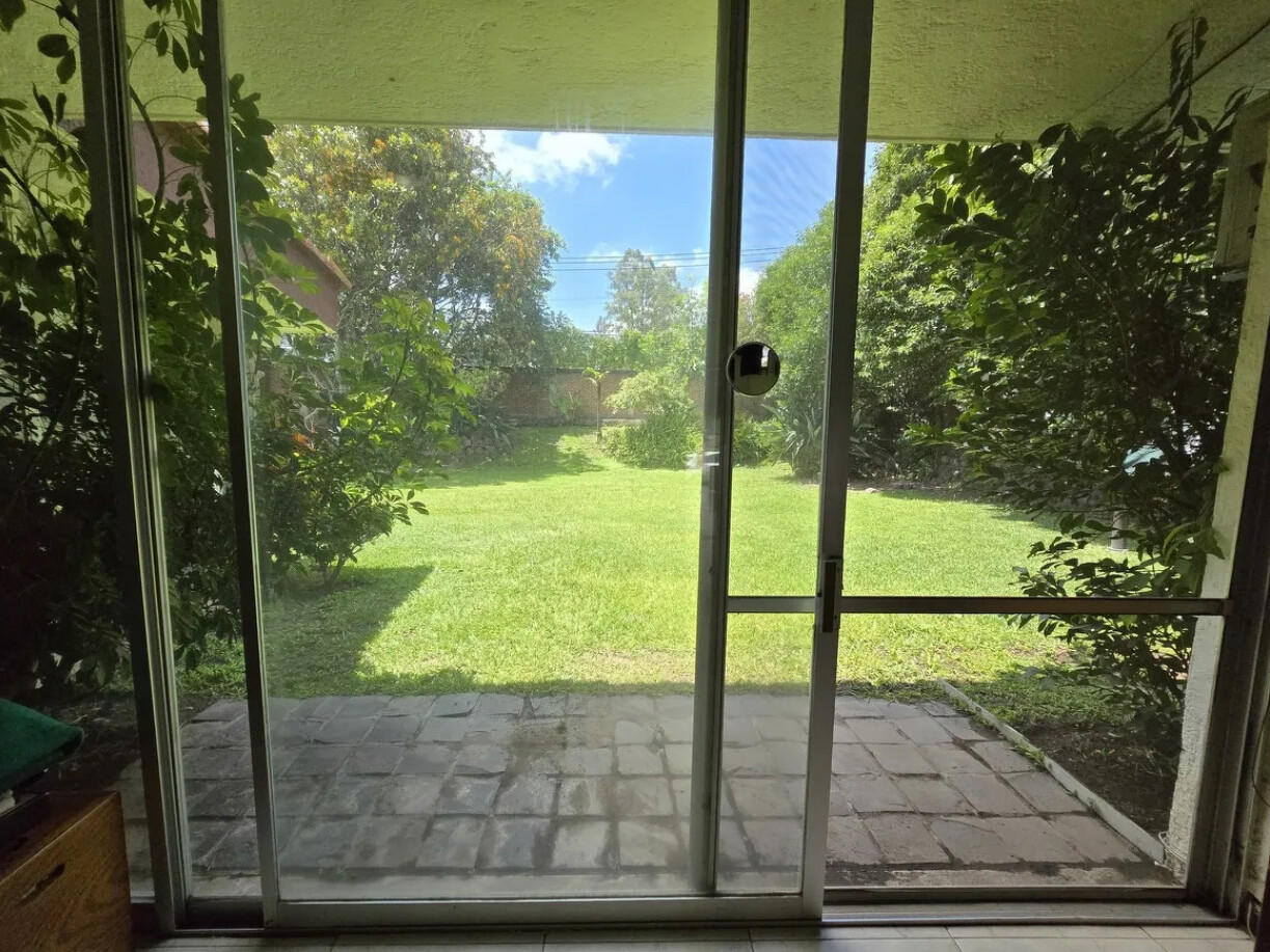 Jardín muy amplio con árboles maduros, áreas verdes y una zona para asador.