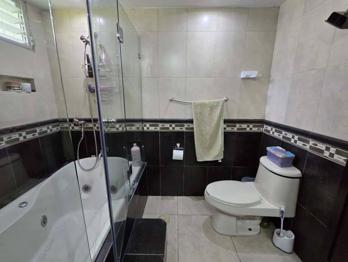 Cuarto de servicio con baño completo, área de lavado y bodega de almacenamiento.